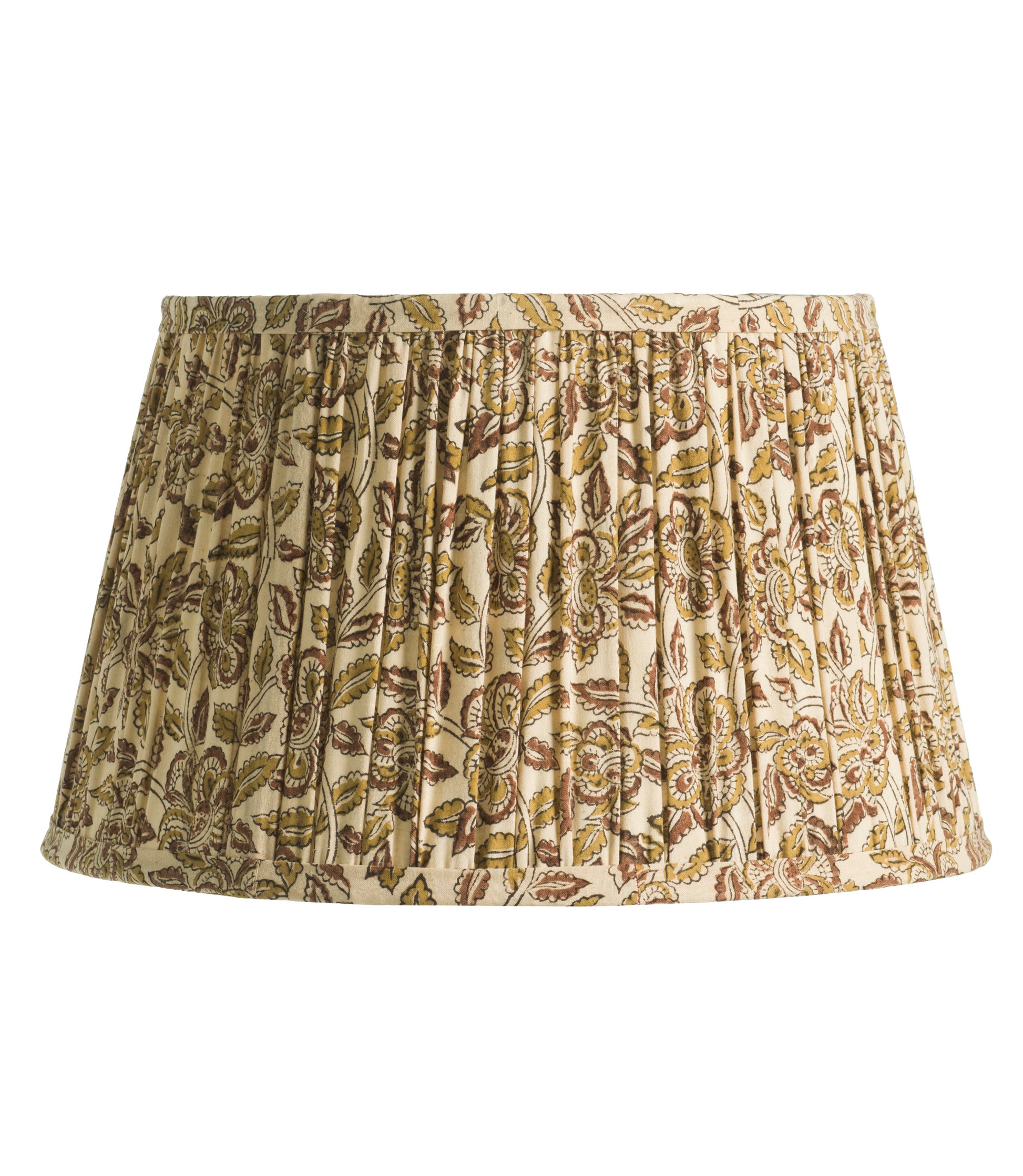 Handgjord, veckad lampskärm i blocktryckt bomullstyg. Fodrad med ljust enfärgat bomullstyg på insidan.