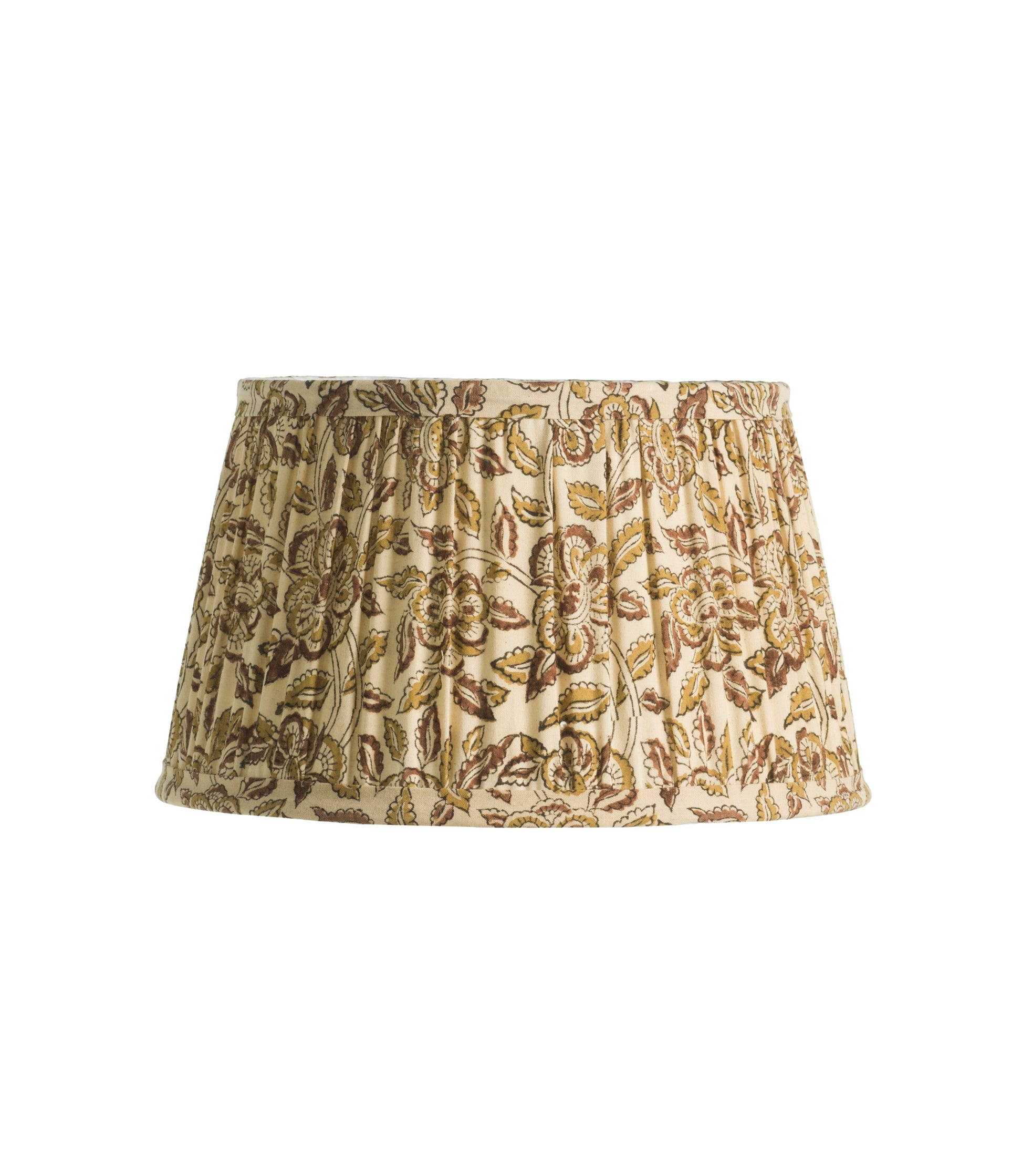 Handgjord, veckad lampskärm i blocktryckt bomullstyg. Fodrad med ljust enfärgat bomullstyg på insidan.